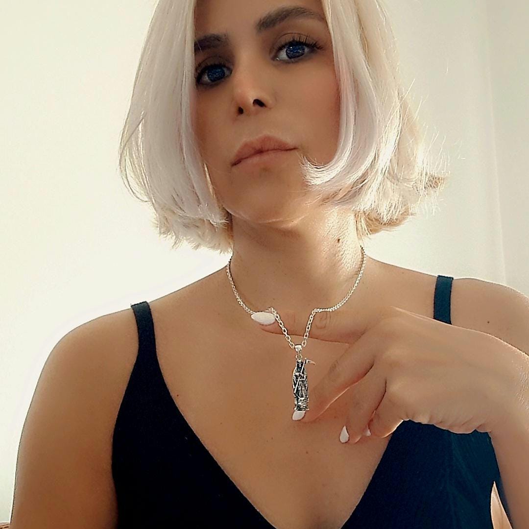 This necklace can be worn with a chain or added to a charm bracelet. It is perfect for those who are drawn to the gothic fashion style or are interested in the symbolism of Santa Muerte.