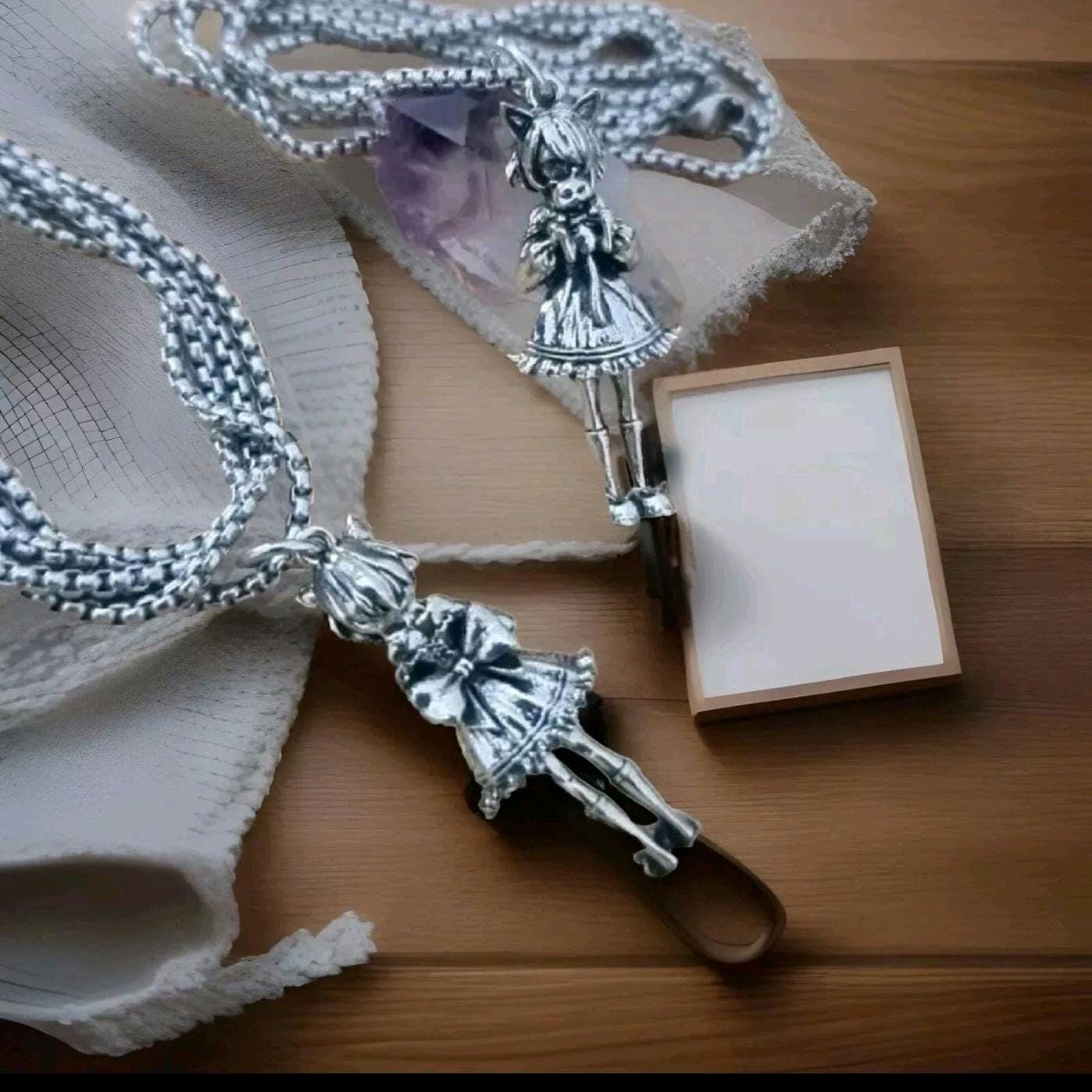Adorable anime girl Hugging a cat pendant adds a touch of playfulness to your look and outfit.