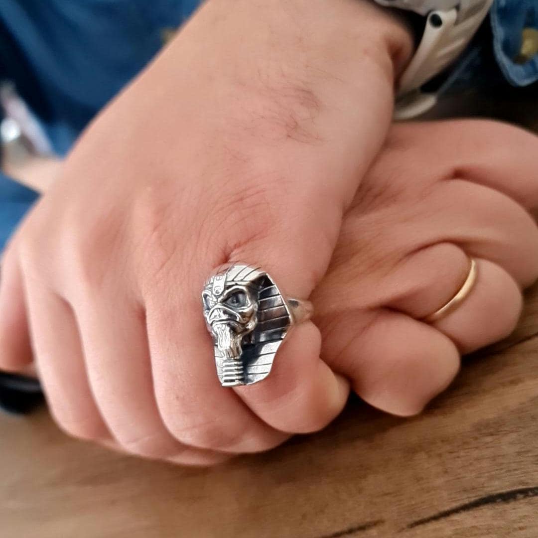Handmade Sterling Silver Pharaoh King Skull Ring: Gothic Biker Jewelry