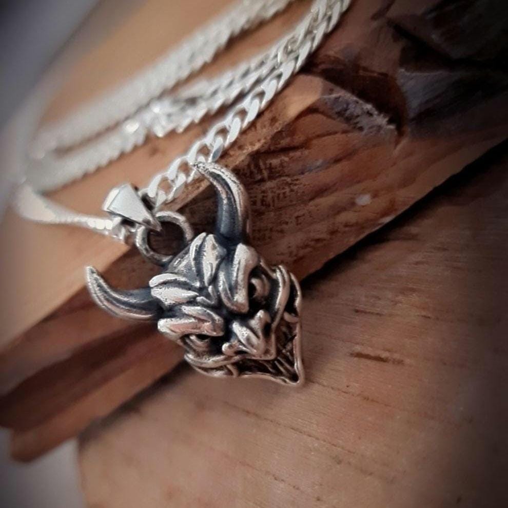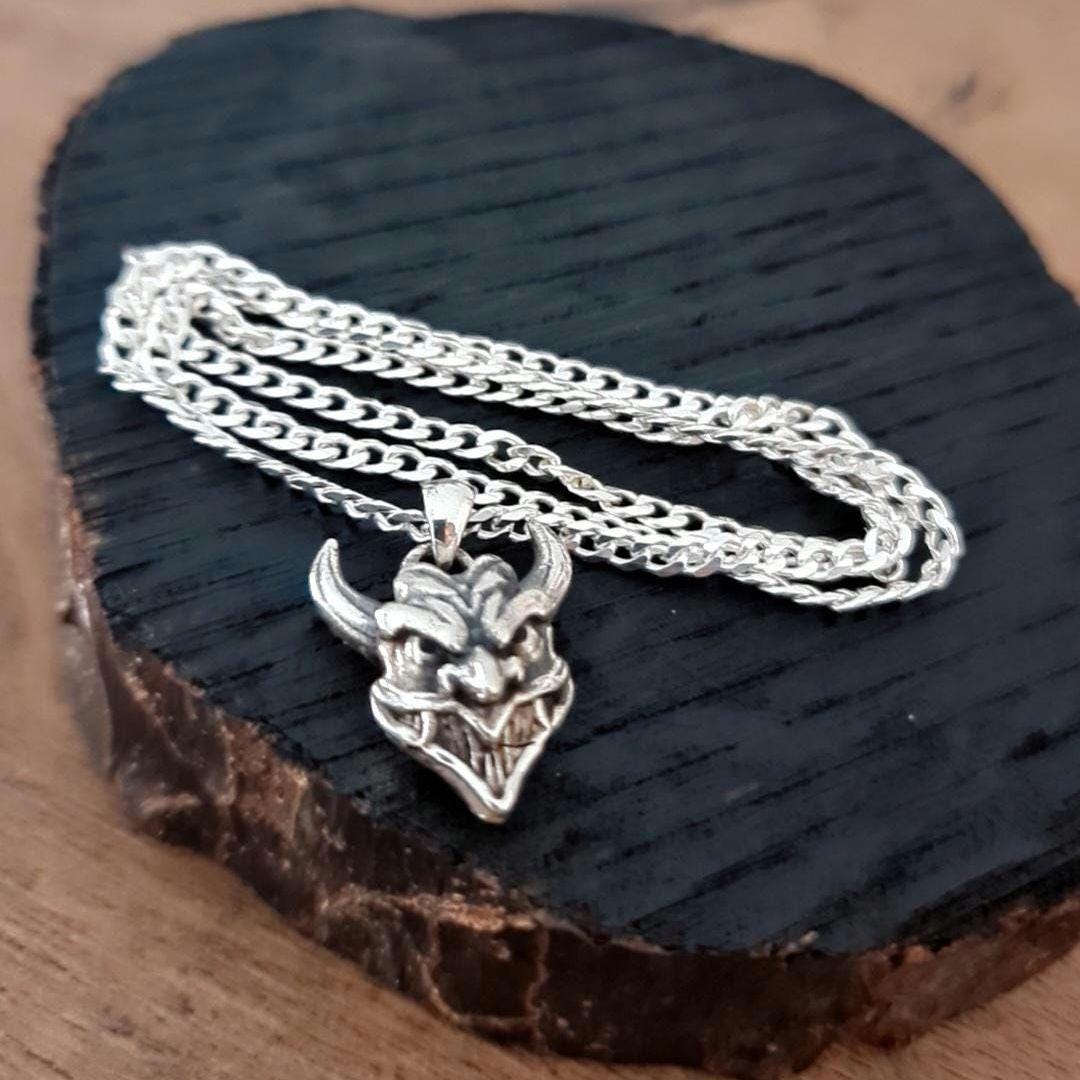 This Pranja Ghost face Japanese Oni Mask Pendant is a unique piece of jewelry with its intricate and anatomically accurate design. Handmade from high-quality 925 silver, this ring is meticulously crafted to capture every detail of the Pranja Ghost face Japanese Oni Mask , making it a true work of art.