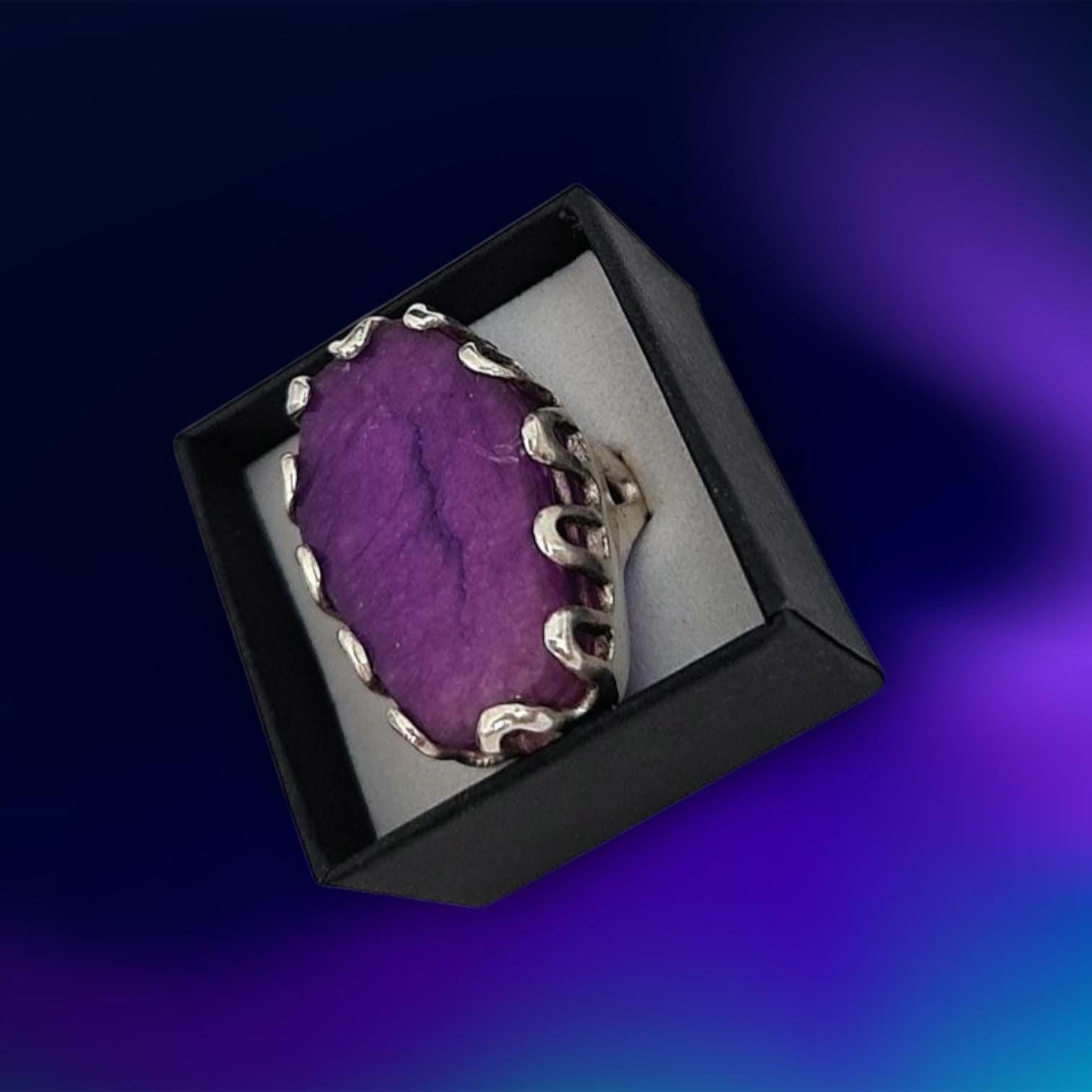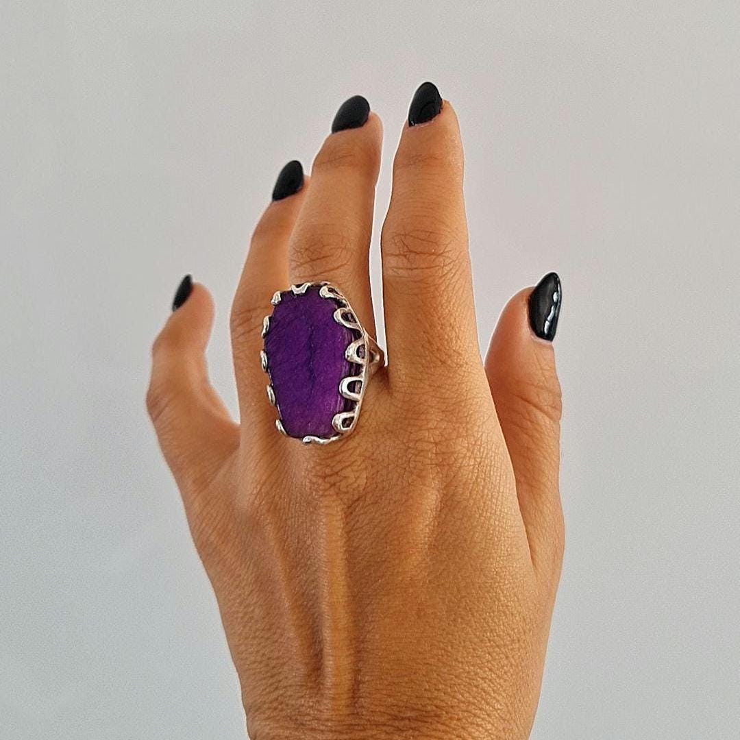 This striking silver statement ring features a bold coffin-shaped purple stone, carefully set in a heavy 26 gram handcrafted band. Designed for both men and women, it’s a standout piece with a strong gothic and alternative style. Perfect for those who love unique, chunky jewelry with personality. Wear it as a fashion statement, a symbolic piece, or a gift for someone with an eye for the unusual.