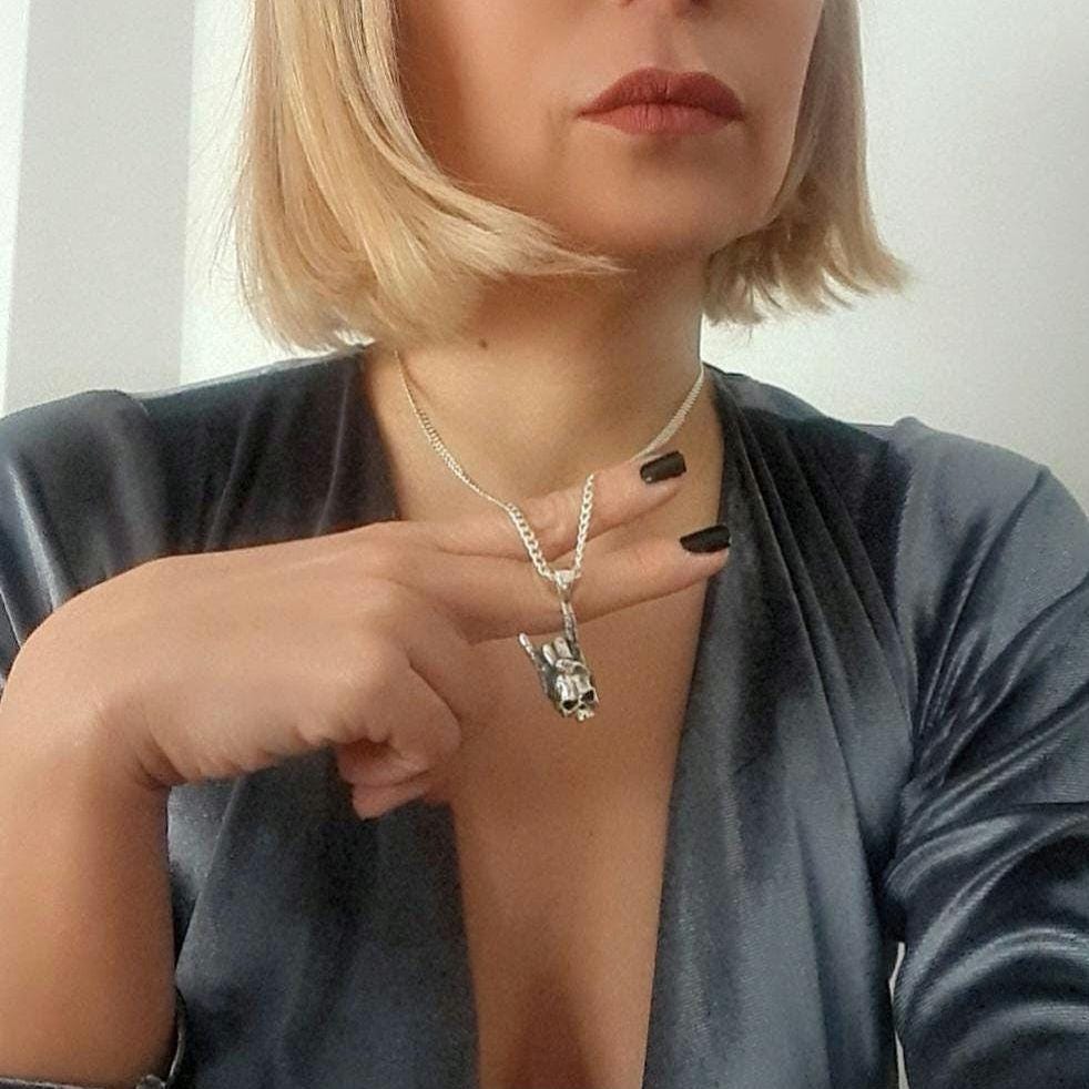 Make a bold statement with this handcrafted sterling silver pendant featuring a skull and raised hand in the iconic rock-and-roll devil horns gesture. Perfect for lovers of gothic, biker, metal, or alternative fashion, this unique piece adds edge and character to any look.