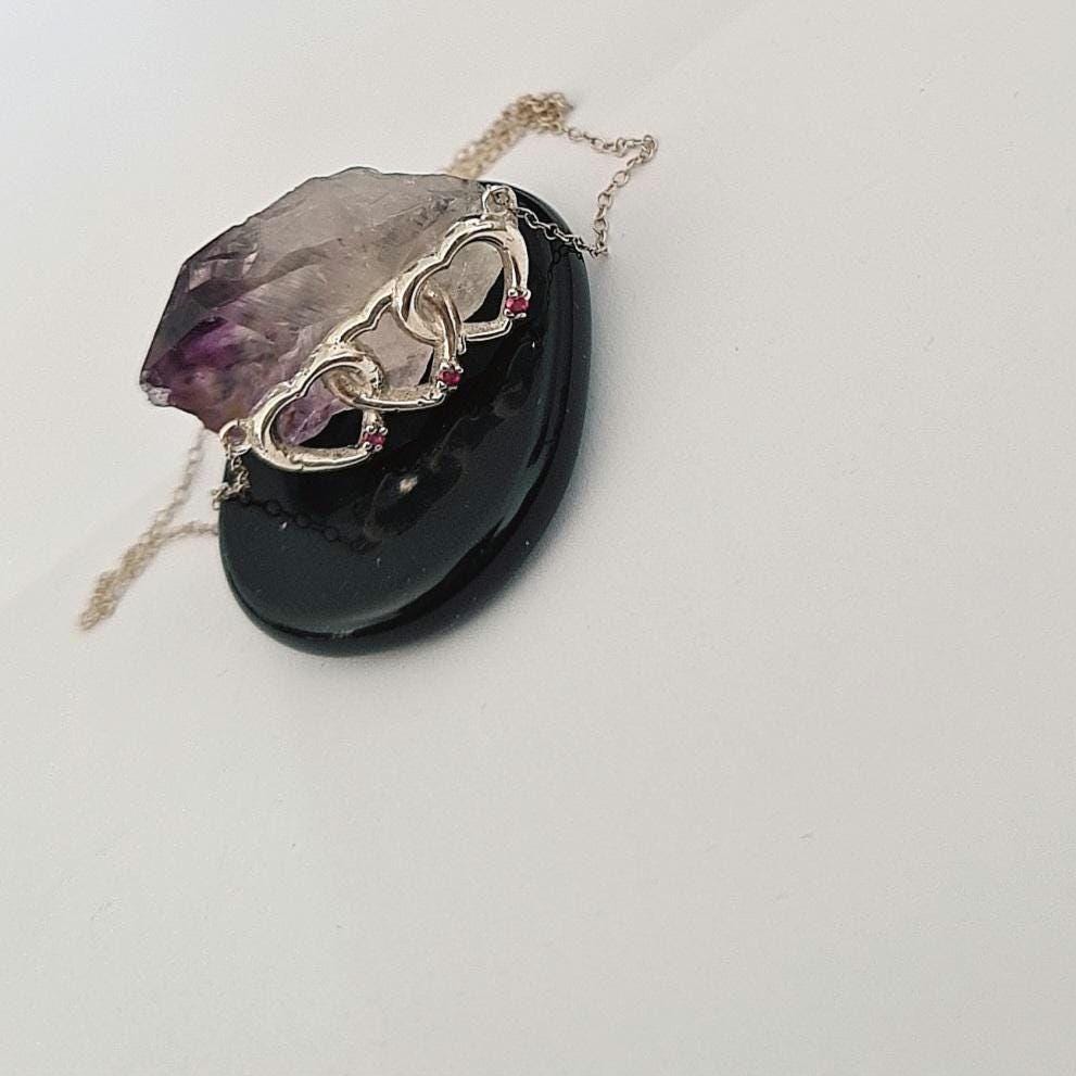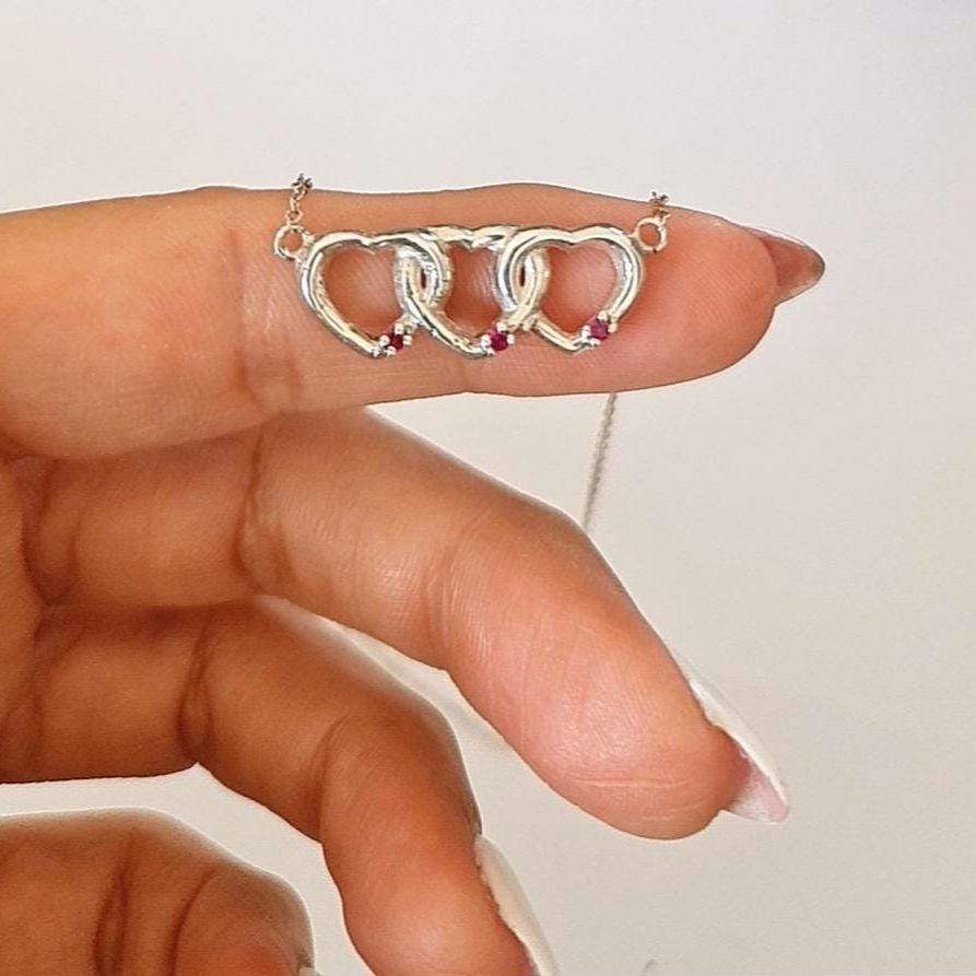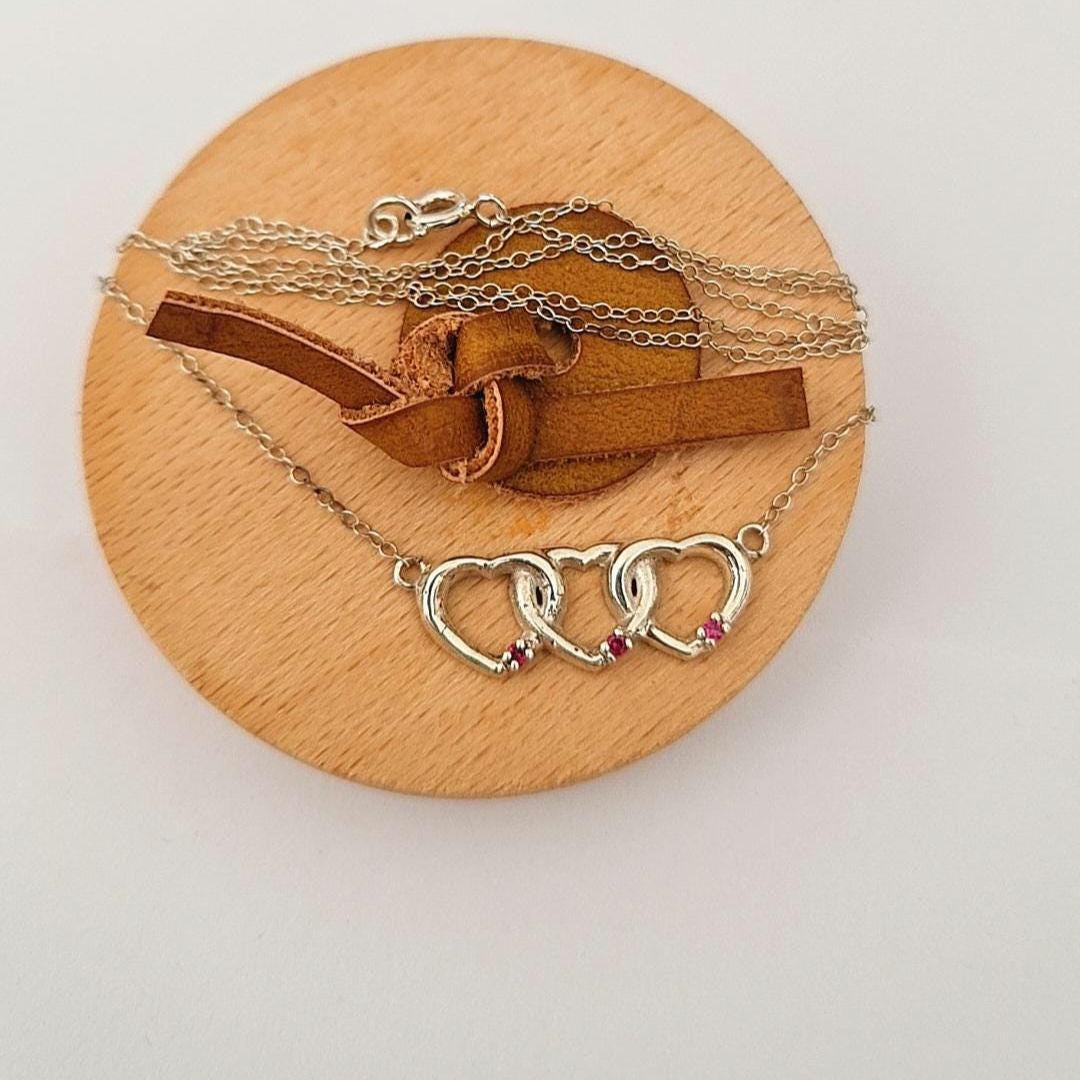 This elegant sterling silver necklace features three beautifully interlocking heart knots, symbolizing eternal love, unity, and connection. Each heart is delicately accented with tiny red stones, adding a subtle sparkle and touch of romance. With its timeless design, this necklace makes a meaningful gift for anniversaries, Valentine’s Day, birthdays, or simply to show someone special how much they mean to you.