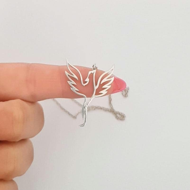 This elegant sterling silver phoenix necklace features a graceful, minimalist bird design symbolizing rebirth, strength, and new beginnings. The openwork silhouette highlights its delicate wings and long tail, making it a unique statement piece that remains lightweight and comfortable to wear daily. Perfect as a meaningful gift, the phoenix pendant comes on a 45 cm silver chain, suitable for layering or wearing alone. A timeless piece for those who value symbolism, resilience, and freedom, this necklace will inspire and uplift any outfit. Ideal for birthdays, anniversaries, graduations, or personal milestones, it’s a beautiful way to express encouragement and love. Handcrafted with care, this necklace is made from high-quality sterling silver for durability and lasting shine.
